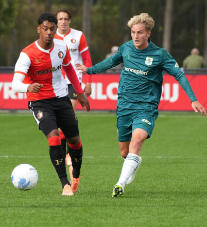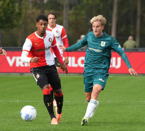 FEYENOORD 021 WINT VAN ONMACHTIG PEC ZWOLLE 021 MET 4-0 EN DOET WEER MEE BOVENINVandaag stond er maar 1 ding op de planning bij de coach van Feyenoord 021, er moest gewonnen worden.Tegen een team wat niet voor niets laag staat kwam Feyenoord 021, dat wel de betere was, moeilijk tot combineren voorin. Toch was er wel behoorlijk snel de 1-0 door Theodoros Delianidis. Pas in de 42e minuut werd het 2-0, door een strafschop benut door Shaqueel van Persie, ondanks het grote veld overwicht. In de 2e helft in barre omstandigheden wat weer betreft scoorde de gevaarlijkste aanvaller van Feyenoord 021 Jaden Slory de 3-0. Yoram Boerhout maakte tegen het einde van de wedstrijd nog de 4-0 waardoor Feyenoord 021 weer stijgt op de ranglijst.Foto’s Feyenoord 021 - PEC Zwolle 021